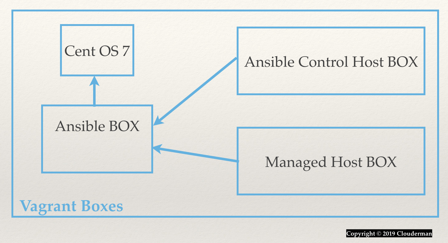 Because I chose to have the same OS (Cent OS 7) for both Ansible Control Host and Managed Host, I can use an intermediary step to build an Ansible Vagrant BOX (Ansible BOX). And based on this Vagrant BOX I will build the Control Host and the Managed Host for the Ansible LAB.